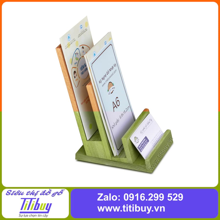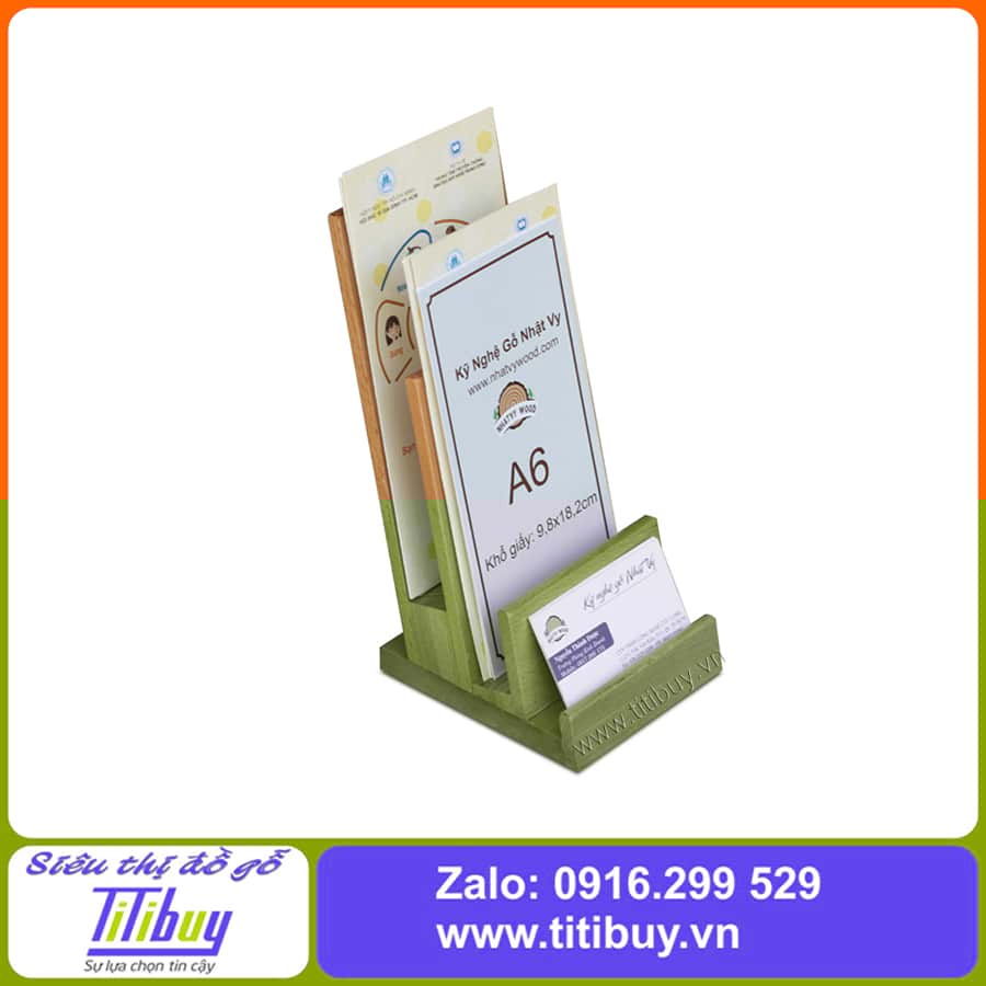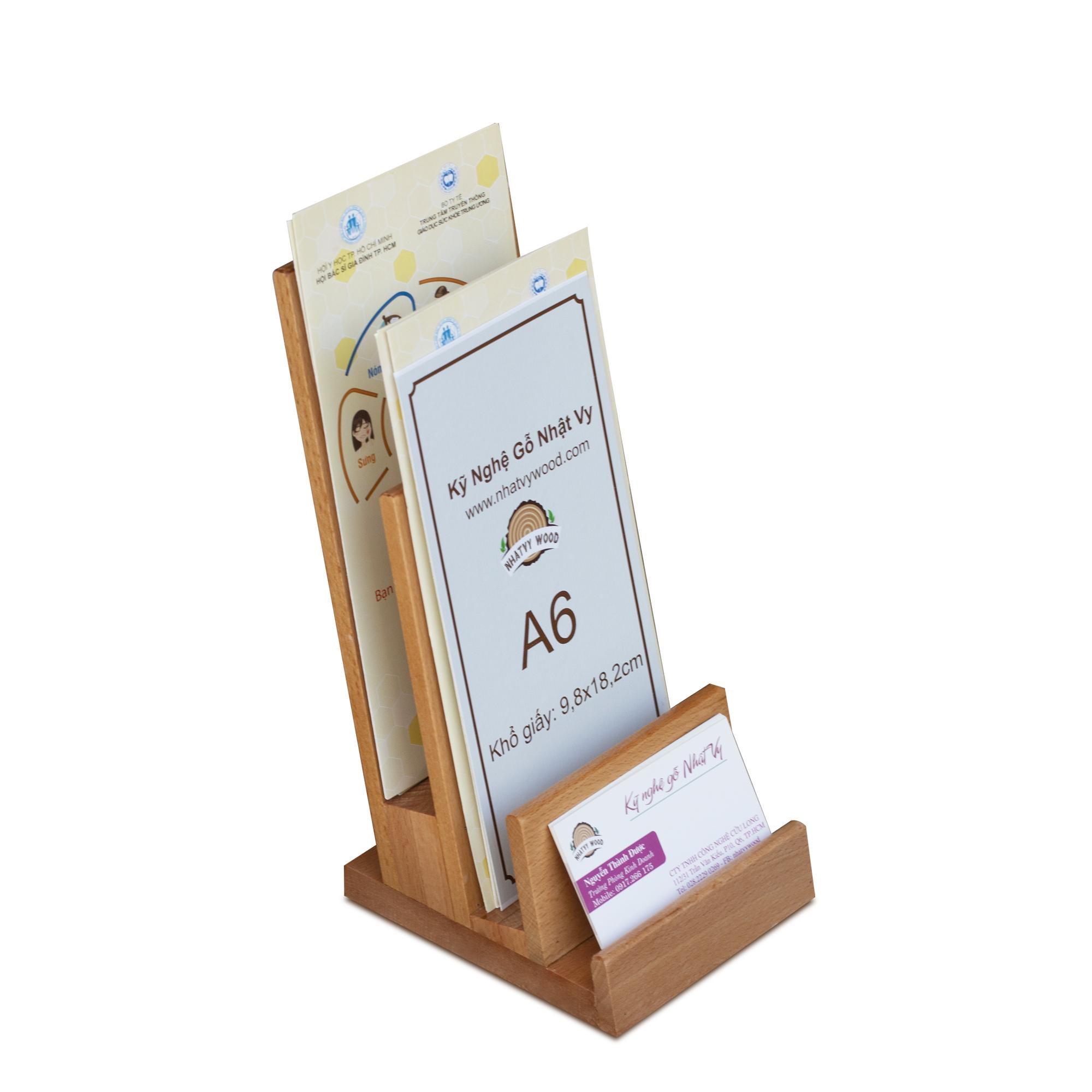 Kệ tờ rơi gỗ A6-NV7161 được làm 2 tầng có ngăn để name card kiểu dáng sang trọng rất tiện lợi để trưng bày và đựng tờ rơi quảng cáo, brochure, catalogue, menu v.v..
